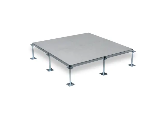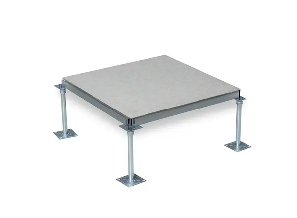The raised access floor panel consists of a welded steel shell with a cement-filled core.
